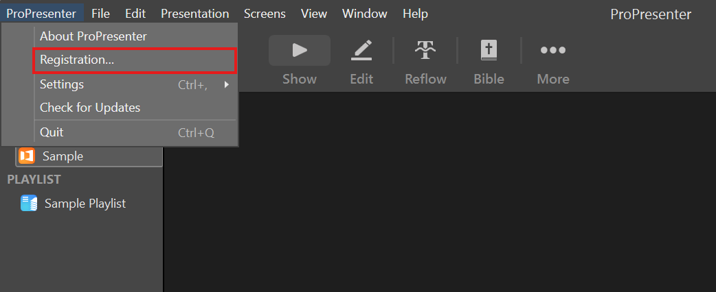 When inside the ProPresenter app, you click "Registration" in the top-right corner.